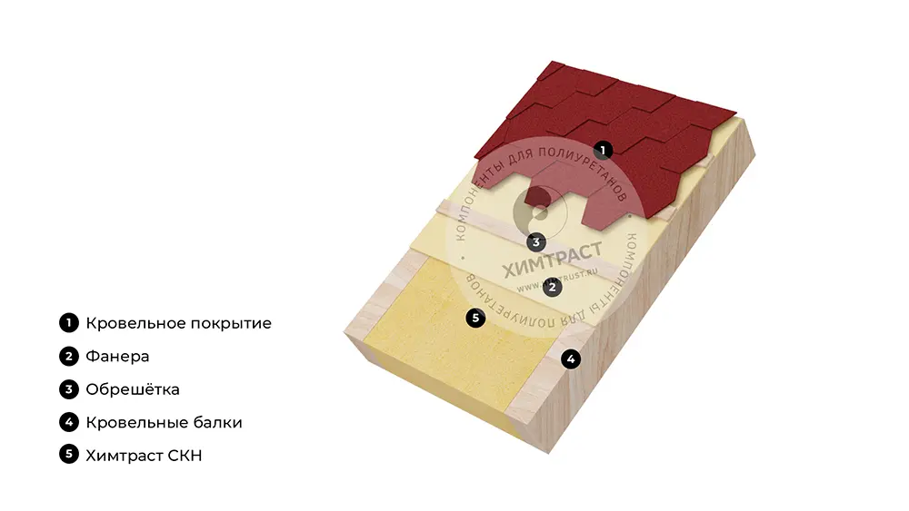 3) Двухкомпонентная система для производства закрытоячеистых жестких пенополиуретанов. Отвечает требованиям по повышенному классу горючести — огнестойкие компоненты. Используется для теплоизоляции мало эксплуатируемых кровель (только ремонтные и уборочные работы).